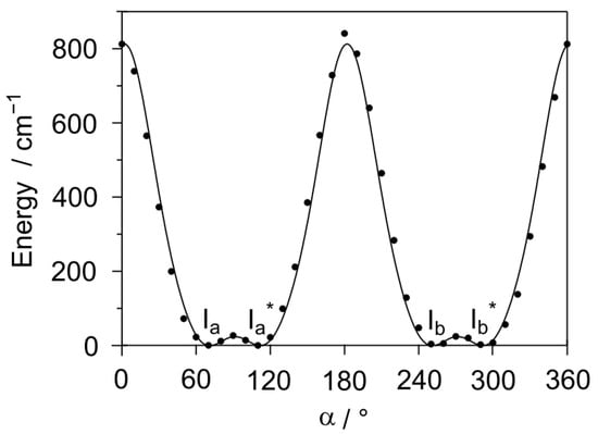 Potential energy curve of phenyl acetate obtained by varying the dihedral angle α = ∠(C13-O12-C3-C2) in 10° steps. The two double minima correspond to the Ia/Ia* and Ib/Ib* pairs. The barrier to convert Ia in Ia* or Ib in Ib* is 20.65 cm−1; that to convert Ia in Ib or Ia* in Ib* is 837.45 cm−1. The minima are at α = 70°, 110°, 250°, and 290° with an energy of E = −458.9579885 Eh. All other energy values are relative to this value.