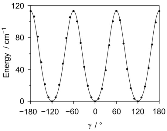 The dihedral angle γ = ∠(O15-C13-C14-H16) was varied in a 10° grid to calculate the torsional barrier of the methyl internal rotation. The potential curve is given in Figure 4. From the Fourier parameterization (see Table S1 in the Supplementary Materials), we determined a V3 term of 113.18 cm−1. A very similar value of 113.40 cm−1 was deduced by optimizing the maxima as transition states [].