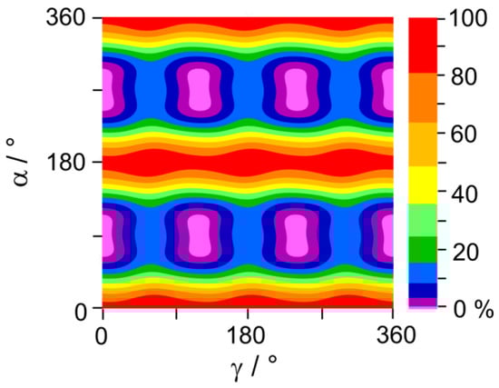 To study the coupling between the two LAMs, we calculated a two-dimensional potential energy surface (2D-PES) depending on α and γ, as shown in Figure 5. The obtained energy points were also parameterized using a Fourier expansion, including terms with the correct symmetry of α and γ given in Table S3 in the Supplementary Materials. Along the γ-axis, the threefold symmetry of the methyl group can be clearly seen. For a given γ minimum, for example, γ = 0°, the four equivalent structures along the α-axis are also recognizable. The minima regions of this 2D-PES are very broad and flat. Therefore, more colors were used in the lower 50% area to enable the distinction of the four minima.