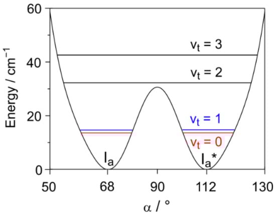 where B2 is the barrier at τ = 0° and τ0 is the equilibrium value of the inversion angle. Such an equation is suitable to describe our potential energy function in a small interval that includes the two minima and the “transition state”. The energies and wavefunctions of vibrational states related to the skeletal torsion were calculated numerically with a suitable model []. We fixed the parameter τ0 to the ab initio value, calculated B2, and applied Meyer’s one-dimensional numerical flexible model []. The value ΔEA0/A1 = 36.4 GHz was reproduced when B2 was set to 68 cm−1. In the flexible model calculation, the τ coordinate has been considered in the ± 50° range and solved into 41 mesh points []. This range is expected to reproduce the low energy part of the potential energy curve of this motion, describing the minima and the barrier at the perpendicular configuration. The value of B2 = 68 cm−1 is considerably higher than the value obtained by the Hamiltonian in Equation (1). This discrepancy can be due to the fact that, with the numerical method, the value of the reduced constant of the motion F is calculated for every point, and it undergoes significant variations in the considered range.