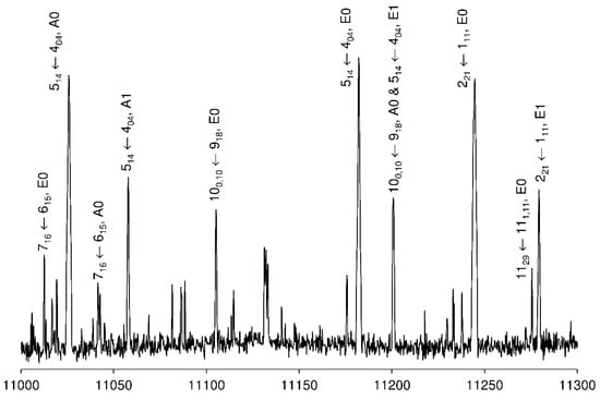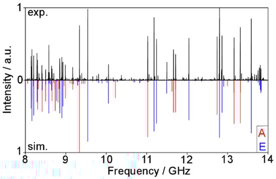 The predictive power of Fit A0/A1 and Fit E0 enabled us to exclude all lines belonging to the A0, A1, and E0 species from the recorded scan. It was then possible to identify some E1 species lines corresponding to the most intense E0 lines, which are of similar intensity as those of the A1 species, as shown exemplarily for the 221 ← 111 transitions in Figure 9. Eventually, we found 17 E1 lines and fitted them together with the E0 lines using spfit. This fit is given as Fit E0/E1 in Table S5 of the Supplementary Materials. Similar to Fit A0/A1, the rotational and centrifugal distortion constants were fitted separately for the E0 and E1 species. Odd power order parameters are required, as in the case of Fit E0. They are fitted separately for the E0 and E1 species. Due to the low intensity of the E1 lines, we could not close any combination difference loops. Consequently, though we are confident about most of the E1 assignments, conclusive proof is lacking. The fit chosen for Table S5 has an rms deviation of 358.8 kHz, but we had to take out 9 E0 lines with Ka = 3. Therefore, this high rms deviation may arise from the limited number of fit parameters. The frequency list is also given in Table S5.