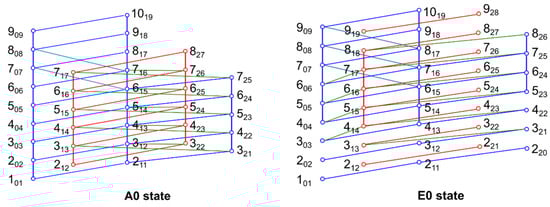 Assigning the E0 state was a tedious task because the spfit/spcat program suite was not useful at the initial stage for assigning the internal rotation E species lines and the XIAM program could not deal with the tunneling motion of the phenyl ring. We first used XIAM to predict a theoretical microwave spectrum for the scan region (8–14 GHz) with the rotational constants of Fit A0 given in Table S4 of the Supplementary Materials, the V3 potential term, and the angles between the internal rotor axis and the principal axes of inertia obtained from calculations at the MP2/6-311++G(d,p) level. The most intense b- and c-type ← = 413 ← 303, 514 ← 404, 616 ← 505, 220 ← 110, 321 ← 211, 221 ← 111, 322 ← 212 lines could be identified, being of similar intensity as the corresponding A0 species. Starting from these assignments, we explicitly searched for the same combination difference loops as those found for the A0 species (see Figure 8). After a sufficient number of lines had been assigned, a separate fit of the E0 species was performed with spfit using the same parameters accounting for the ring tunneling motion (E, EJ, Fab, and Fbc). In addition, two odd power order parameters, Da and Dc, as well as their higher-order parameters, DaK, DcK, DcJK, and DcKK [], are required to fit the E0 state separately, as implemented in the operator, as follows: