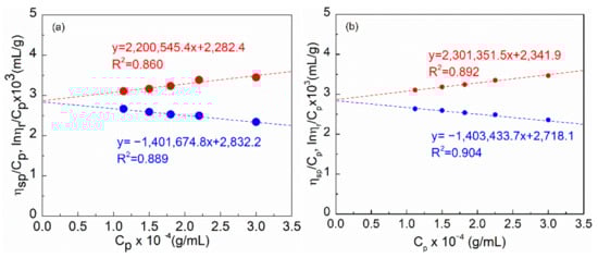 ηsp/Cp and lnηr/Cp plotted as a function of polymer concentration for (a) HAP and (b) HPAM at 30 °C.