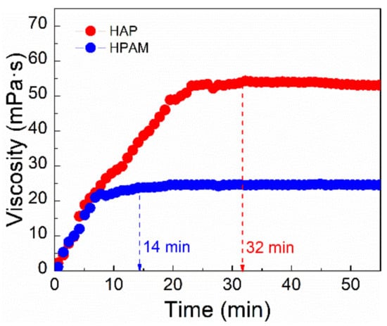 The growing trend of the apparent viscosity of HAP after 32 min remained steady, indicating that the HAP polymer has good solubility in Bohai seawater. This might be due to the addition of a SO3− hydrophilic group to HAP, which shortened the time required for solution in brine. Also, the polyoxyethylene ether groups of POM monomer is hydrophilic, which can help dissolve HAP in aqueous solution. In contrast, the maximum viscosity of the HPAM solution was attained in 14 min, indicating that the HAP polymer was substantially more soluble in brine; but the maximum of HPAM is 26.3 mPa⋅s, much lower than the solution of HAP.