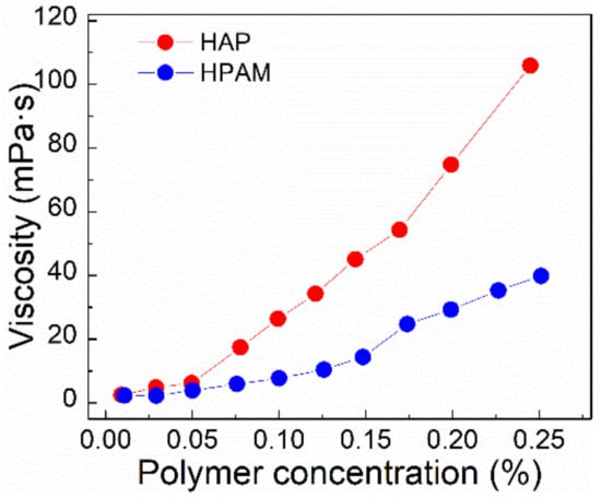 For HAP and HPAM, the viscosity as a function of concentration is displayed at 75 °C. (Particle size of polymer powder, 40–120 mesh; salinity, 3.26 × 105 mg/L; shear rate, 7.34 s−1).