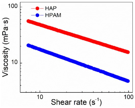 The connection between apparent viscosity and shear rate for HAP and HPAM solutions is depicted in Figure 6. The apparent viscosity decreased with the shearing rate, which is consistent with the fact that the viscosity of normal polymer solutions reduces with shearing [29]. When the shearing rate was increased from 7.34 s−1 to 100 s−1, the viscosity retention of the HAP and HPAM polymer solutions was 27.8% and 22.8%, respectively. It shows that the HAP solution has a better shear resistance than the HPAM solution. The reason is that the smaller absolute value of the slope means the decrease of the apparent viscosity of the polymer solution was slower with the increasing shearing rate, and the shear resistance was better. The shear resistance of HAP was significantly better than that of HPAM, owing to the associative effect of hydrophobic chains of HAP. In comparison, the HPAM structure would be further destroyed by shearing. The addition of a functional monomer POM with a hydrophobic associative chain may produce the physical network among molecular chains of HAP, hence increasing the shear resistance of HAP.