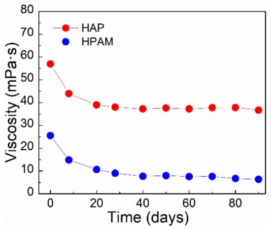 As seen in Figure 8, the HAP solution exhibits high thermal stability when compared to the HPAM solution. After 90 days of ageing at 75 °C, the viscosity of the HAP solution is still more than 30 mPa⋅s, which is 20 mPa⋅s greater than the viscosity of the HPAM solution. The reason for HAP’s viscosity retention is that HAP contains the more thermally stable comonomer AMPS and the hydrophobic associative monomer POM. As previously stated, AMPS’s structure efficiently prevents the amide group from being hydrolyzed. Thermal stability of HAP contributes to higher viscosity retention over the period of the long-term oil displacement process in reservoir environments.