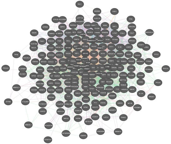The FINDSITEcomb tool was used for drug screening against the identified top ranked gene(IFI44L) in the network. FINDSITEcomb receives a target sequence as input and applies the convolution neural network (CNN) algorithm to determine the best molecule from the 6507 molecules available in the DrugBank library. Further, the screened ligand was subjected to molecular docking to determine the binding efficiency with the target (IFI44L). For docking, the structure of vemurafenib (Compound CID: 42611257) was retrieved in SDF format from the PubChem database (https://pubchem.ncbi.nlm.nih.gov/) (accessed on 15 February 2022). Similarly, the 3D structure of protein was searched using a relevant protein name or uniprot id (Q53G44) in the PDB database. If there was unavailability of protein structure in PDB, we used a similar search term to collect the predicted structure from the Alphafold database. Using AutoDock Vina (Scripps Research, California, CA, USA), vemurafenib was docked with the IFI44Lto determine the binding efficiency, and their interaction was visualized using the BIOVIA Discovery Studio Visualizer.
