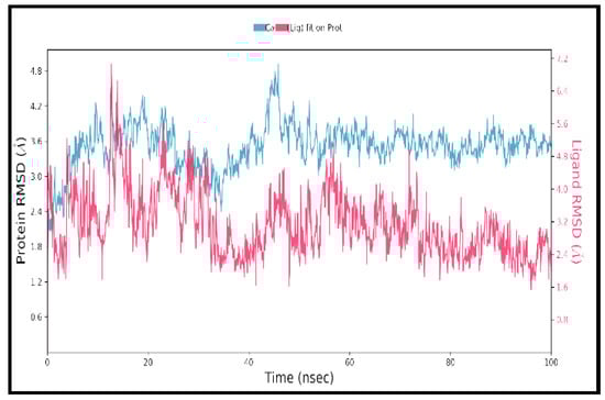 We used the Desmond (Schrödinger LLC, New York, NY, USA) setup for the high-speed molecular dynamics simulation for the analysis of our model. In general, MD simulations estimate atom movements over time by incorporating Newton’s classical equation of motion. The ligand-binding position in the physiological context was estimated using simulations [,]. In our study, the molecular dynamics were carried out for a period of 100 nanoseconds []. Protein Preparation Wizard and Maestro (chrödinger LLC, New York, NY, USA) were utilized to preprocess the protein–ligand complex. All of the systems were created using the System Builder tool. TIP3P, an orthorhombic box solvent model, was chosen (Intermolecular Interaction Potential 3 Points Transferable).The OPLS 2005 force field was included in the simulation []. Counter ions were utilized to balance the model. 0.15 M sodium chloride (NaCl) was introduced to simulate physiological circumstances. An isobaric-isothermal ensemble was chosen for the phase with a temperature of 300 kelvin and 1 atmospheric pressure maintained throughout. Finally, the stability of the simulation was assessed using root mean square deviation (RMSD), root mean square fluctuation (RMSF), and a histogram of protein–ligand interaction.