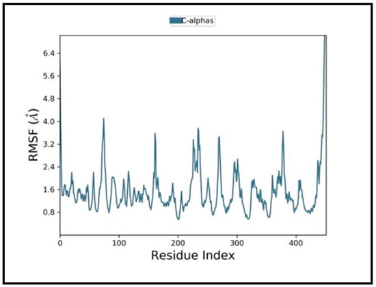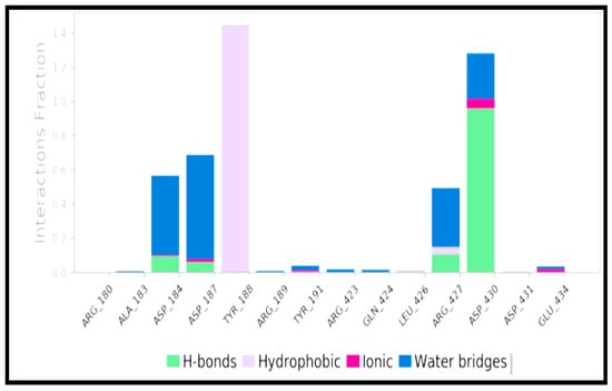 MD simulation is potentially used to assess the dynamic behavior of ligand–protein complexes. Figure 3 depicts the root mean square deviation (RMSD) of the protein-ligand complex over 100ns time. Left Y-axis denotes protein RMSD, while the right Y-axis denotes ligand RMSD. At 18 ns, the complex achieves stability, and thereafter the RMSD values remain with minimal drift. After equilibrium, the ligand match to protein RMSD values varies around 1.0. These results indicate that the ligands stayed securely attached to the receptor’s binding all through the simulation. Additionally, root mean square fluctuation (RMSF) was assessed, which provides the deviation of a particle on the portions of the structure that fluctuate from the original structure. Lower values denote the stability of the protein–ligand binding. Figure 4 depicts the RMSF of the protein and reveals that the loop areas (=N and C terminal zones) show significant peaks, whereas the α-helices and β-strands appear firmer. Simultaneously, protein–ligand interactions are characterized through hydrogen bonds, ionic interactions, water bridges, and hydrophobic interactions that are visually depicted in Figure 5 in the form of a bar chart. The most significant interactions throughout the docking simulation are hydrogen bonds and hydrophobic interactions (Figure 5). ASP_430 is the most critical bond, and TYR_188 is the most critical hydrophobic interaction.