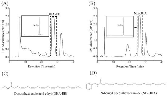 Fish oil was hydrolyzed by lipase into free fatty acids, which were used for the synthesis of DHA-EE via the esterification reaction and NB-DHA via the carbodiimide condensation method. The DHA-EE and NB-DHA fractions were collected separately from an HPLC system with elution times of 26.5–30.5 and 26.0–29.0 min, respectively. Both collected fractions were rotary evaporated to dryness and identified by infrared spectroscopy and mass spectrometry (data not shown). Their purities, analyzed by HPLC, were 96.2% (DHA-EE, Figure 1A) and 98.3% (NB-DHA, Figure 1B). The dried samples were used for subsequent animal experiments.
