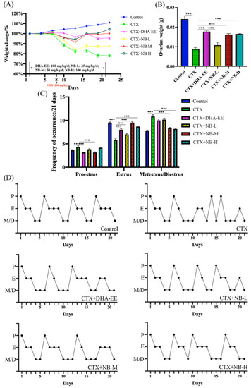 As shown in Figure 2A, CTX caused a significant decrease in body weight compared with the control group. The body weight of mice in all DHA-treated groups was significantly higher than that of mice in the CTX group at the end of the 21-day experiment, and body weight recovery was ranked as follows: CTX+NB-H > CTX+NB-M > CTX+DHA-EE > CTX+NB-L. Additionally, compared with the control group, CTX significantly decreased the ovarian weight in the CTX group. After modeling with CTX, ovarian atrophy and ovarian weight decreased significantly. The ovarian weight of mice in the CTX+NB-H, CTX+NB-M, and CTX+DHA-EE groups was higher than that in the CTX group (Figure 2B). CTX is an inducer for the ovarian model that involves prolonging or stagnating the female estrous cycle. The statistical results showed that the time of estrus was shortened, and proestrus, metestrus, and diestrus were prolonged in the CTX group, indicating a disordered estrous cycle in CTX-treated mice (Figure 2C). The 21-day complete estrous cycle of mice was plotted, and the results showed that the average estrous cycle of the control group was 5–6 days. In the CTX group, a complete cycle could not be observed after modeling, but a complete estrous cycle could be observed in each DHA group. DHA-EE and NB-DHA were both effective in alleviating the disorder of the estrous cycle and were ranked as follows: CTX+NB-H > CTX+NB-M > CTX+DHA-EE (Figure 2D).