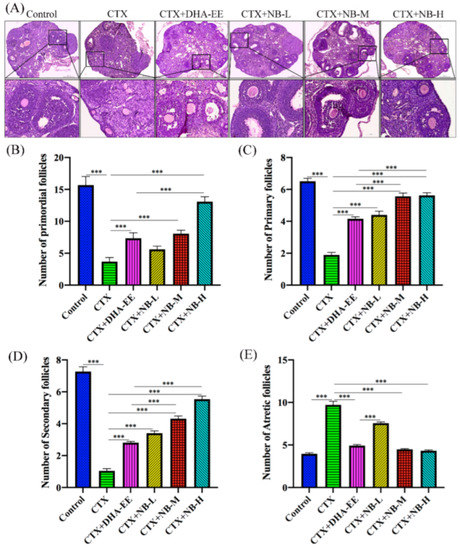 The effects of DHA-EE and NB-DHA on follicular development were analyzed by H&E staining of the ovarian sections (Figure 3A). Abundant healthy follicles were observed in the control group, including primordial, primary, secondary, and atretic follicles, while the distribution of the four types of follicles in the other groups was altered (Figure 3B–E). For example, there were fewer primordial, primary, and secondary follicles, but more atretic follicles in the CTX group than in the control group. Compared with the CTX group, both CTX+DHA-EE and CTX+NB-DHA significantly increased the number of primordial follicles, especially in the CTX+NB-M and CTX+NB-H groups. Moreover, there were fewer atretic follicles in all DHA-treated groups than in the CTX group. The groups ranked as follows: CTX+NB-H > CTX+NB-M > CTX+DHA-EE > CTX+NB-L.