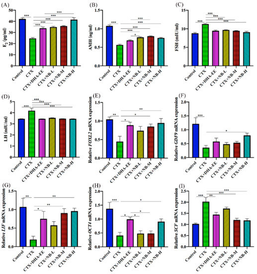 The formation, maturation, and growth of follicles are regulated by many intra- and extra-ovarian factors. FOXL2 is involved in multiple dysfunctional states in the ovary and is essential for GC differentiation and maintenance of ovarian function, and is expressed in GCs with low differentiation in small- and medium-sized follicles [35]. GDF9 encodes a protein secreted into the follicle by oocytes [36] and plays a pivotal role in optimizing the oocyte microenvironment and growth, development, atresia, ovulation, fertilization, and normal reproduction of the follicle [37]. It also has a role in promoting the proliferation and apoptosis of GCs while stimulating the expression of Kit ligands on GCs. LIF is expressed in the ovaries and promotes follicle growth. LIF has also been shown to coordinate follicular growth and ovulation sequences and can locally regulate follicular growth [38]. Oct4 has the potential to recruit mature oocytes. Overexpression in ovarian stem/stromal cells enhances oocyte-like differentiation in vitro and follicle formation in vivo [39]. SCF is essential for the early follicular development. It stimulates stromal cell function and promotes follicular growth through the Erk1/2 pathway, and can be used as a crucial regulator of embryo and ovarian growth to exert its biological effects [40,41]. CTX can cause ovarian injury and disorders in the expression levels of these mRNA [40]. Our results also revealed that the mRNA levels of FOXL2, GDF9, LIF, and OCT4 were decreased, while those of SCF were increased in the CTX group. After high-dose NB-DHA treatment, the levels of FOXL2, GDF9, LIF, and OCT4 increased, whereas those of SCF decreased. The mechanism of action of NB-DHA might be to promote the growth and maturation of follicles via the regulation of the mRNA expression levels of these five genes, thereby reversing ovarian injury caused by CTX and protecting the ovaries. At the same dose, the effect of NB-H was better than that of DHA-EE.