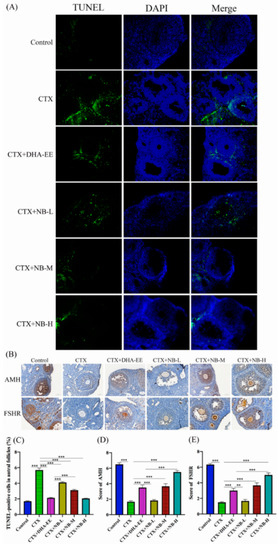 FSHR and AMH expression was detected by immunohistochemical analysis. Positive immunohistochemical results were scored. As shown in Figure 5B, the expression of AMH and FSHR in the CTX group was significantly lower than that in the control group. The expression of AMH and FSHR significantly increased after DHA-EE and NB-DHA treatment (Figure 5D,E). Notably, the effect of NB-H was better than that of DHA-EE at the same dosage. The treatments increased the expression of AMH and FSHR in the following order: CTX+NB-H > CTX+NB-M > CTX+DHA-EE > CTX+NB-L.