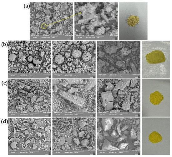 SEM image of Hyp with CD complex systems and their powder image. (a) Hyp (2000× and 5000× magnification) and powder image, (b) Hyp/2H-β-CD complex system, (c) Hyp/β-CD complex system, (d) Hyp/M-β-CD complex system. From left to right: Cyclodextrin image (600× magnification), physical mixture image (600× magnification), IC image (600× magnification), and powder image.