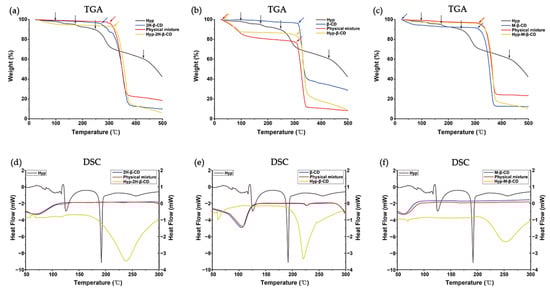 TGA and DSC analysis images of Hyp, CDs, ICs, and their physical mixtures. (a,d) Hyp/2H-β-CD complex system, (b,e) Hyp/β-CD complex system, (c,f) Hyp/M-β-CD complex system.