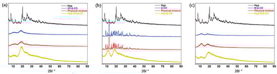 XRPD spectra of Hyp, CDs, physical mixtures, and the ICs. (a) Hyp/2H-β-CD complex system, (b) Hyp/β-CD complex system, (c) Hyp/M-β-CD complex system.