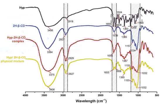 The FTIR spectra of Hyp, 2H-β-CD, the ICs, and their physical mixtures are illustrated in Figure 7. The FTIR spectrum of Hyp provided a large number of fingerprint absorption peaks, and the characteristic peaks of Hyp appeared (as shown in the gray-marked box). The 2H-β-CD FTIR spectrum showed peaks at 3394 cm−1 (O–H stretching vibration), 2927 cm−1 (C–H stretching vibration), 1639 cm−1, 1385 cm−1 (O–H plane bending), 1157 cm−1 (O–H stretching vibration), and 1034 cm−1 (C–O stretching/C–C stretching), as well as other strong absorption peaks. The infrared spectrum of Hyp–2H-β-CD showed similar structure with the infrared spectrum of 2H-β-CD. The peak position was basically consistent with that of 2H-β-CD. Compared to the free guest, the absorption intensity of the benzene ring and carbonyl chromophore in the infrared absorption spectrum of the IC was obviously weakened, which was due to the non-covalent weak force between the host and guest. The strong carbonyl absorption peak of Hyp at 1653 cm−1 appeared in the FTIR spectrum of the ICs, which is strong evidence that Hyp entered the 2H-β-CD cavity as a guest molecule, proving the formation of ICs between 2H-β-CD and Hyp. The other characteristic peaks of Hyp (wave numbers 1504 and 1259 cm−1, etc.) basically disappeared. In addition, Hyp–2H-β-CD showed strong absorption peaks of 3375, 2929, 1653, 1367, 1155, and 1032 cm−1, showing that the structure of 2H-β-CD was not damaged by the inclusion process. The peak of 2H-β-CD at 3375 cm−1 (O–H stretching vibration peak) was significantly stronger and wider than that at 3394 cm−1, indicating that an intermolecular hydrogen bond was formed between 2H-β-CD and Hyp. Moreover, the absorption peaks of 2H-β-CD (1034 and 1158 cm−1) moved to Hyp–2H-β-CD (1032 and 1155 cm−1), which was closely related to vibration (mainly C–C and C–O). The formation of a hydrogen bond led to a change of the bond electron density, which led to a change of the free frequency of stretching vibration, suggesting that a strong intermolecular hydrogen bond coaction occurred between the two. However, no new absorption band was generated in the spectrum of IC, and the formation process only took place as a physical interaction, without a change in the chemical structure. It can be seen from the above changes that the Hyp guest molecule entered the cavity of the host molecule 2H-β-CD instead of experiencing simple physical adsorption, indicating that the two formed a drug delivery system for the ICs. Some characteristic absorption peaks (wave numbers 3406, 2927, and 1655–1035 cm−1, etc.) of the host or guest were retained in the physical mixture of Hyp/2H-β-CD, which was obviously due to the simple addition of the spectra of the two, indicating that Hyp only existed in the mixture. It did not include into 2H-β-CD, which is consistent with the conclusions from literature [46].