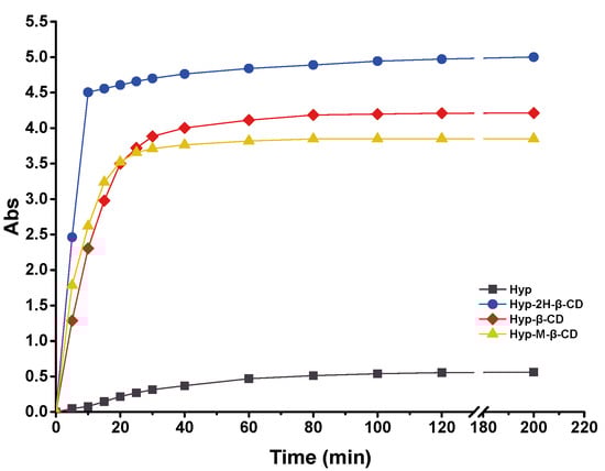 An excess of Hyp (10 mg) or one of its ICs (250 mg) was added to 5 mL of water at 25 °C, and the amount of Hyp in the supernatant was determined every 5 min until the last measurement was performed at 200 min. Each sample was repeated three times to plot the dissolution curves with time of Hyp and its three ICs.