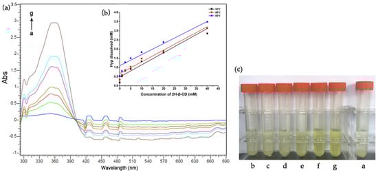 Diagram of the solubility of the Hyp and the IC. (a) UV–vis spectral changes of Hyp (sufficient) upon addition of 2H-β-CD at 40 °C; the concentration of 2H-β-CD (a–g): 0, 1, 2.5, 5, 10, 20, and 40 mM, respectively. (b) Solubility diagrams of Hyp with 2H-β-CD at 30, 40, and 50 °C. (c) Experimental diagram of the dissolution degree of Hyp in different concentrations of Hyp at 40 °C; the concentration of 2H-β-CD (a–g): 0, 1, 2.5, 5, 10, 20, and 40 mM, respectively.