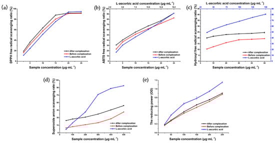To date, a variety of detection methods have been developed based on chemical redox reactions to evaluate the antioxidant activities of flavonoids in traditional Chinese medicine. These detection methods can be roughly divided into two types according to the mechanism involved in achieving the antioxidant properties: single electron transfer or hydrogen atom transfer [54]. The reaction principles of the five detection methods used in this study are different. The 1,1-diphenyl-2-picrylhydrazyl (DPPH) method, based on hydrogen atom transfer, provides a hydrogen atom with the ability to quench free radicals by detecting antioxidants [55]. 2,2′amino-bis (3-ethyl-benzothiazoline sulfonate-6) ammonium salt (ABTS), reducing power, hydroxyl radical, and superoxide anion scavenging tests are typically performed by measuring the transfer of electrons by antioxidants to reduce the oxidability of free radicals or metal ions [56,57]. In addition, the scavenging ability of hydrophobic compounds (DPPH method) and the scavenging level of hydrophilic compounds (ABTS method) were detected in this study. Multiple methods were used to complement one another to fully evaluate the antioxidant ability of Hyp before and after coating. The DPPH test results (Figure 11a) showed that the DPPH radical scavenging activities increased with the increase in the Hyp, Hyp–2H-β-CD, and L-ascorbic acid concentrations in the range of 2.5–15 μg·mL−1 and showed dose dependency. When the sample concentration was added to 20 μg·mL−1, the scavenging rates were 91.14 ± 0.69%, 91.93 ± 0.40%, and 94.05 ± 0.22%, respectively. However, the scavenging activities of the DPPH free radical of the three samples tended to be flat with the increasing concentration. The IC50 of Hyp, Hyp–2H-β-CD, and L-ascorbic acid was 7.136, 6.267, and 8.194 μg·mL−1, respectively. In general, the DPPH radical scavenging ability of Hyp–2H-β-CD was stronger than that of uncoated Hyp, which may have been due to the fact that Hyp–2H-β-CD can release more hydrogen atoms bound to DPPH radicals in water [58].