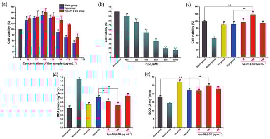 According to Section 3.8.1, the blank, H2O2, L-ascorbic acid (100 µg·mL−1), Hyp (100 µg·mL−1), and Hyp–2H-β-CD inclusion complex (50, 100, and150 µg·mL−1) groups were set. The blank and H2O2 groups used serum-free 1640 medium. After 24 h of drug treatment, the medium was removed and then, after washing, serum-free 1640 medium containing 400 µM of H2O2 was added for 2 h to calculate the cell survival rate.