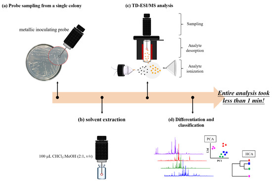 To date, thermal desorption–electrospray ionization/mass spectrometry (TD-ESI/MS) combined with probe sampling has been demonstrated to be a useful AIMS for rapidly detecting various chemical compounds without performing tedious sample pretreatment [35]. Volatile or semi-volatile chemical compounds on different surfaces and in solutions were successfully detected by TD-ESI/MS, such as residual pesticides on fruit and vegetable surfaces [36,37], preservatives, UV filters and photoproducts in cosmetics [38,39], phthalates on the surface of various objects [40,41], illicit drugs in adulterated samples [42], and ingested pesticides and medicine in biofluids [43,44,45,46,47]. Due to its simplicity and speed of operation, TD-ESI/MS might be a practical bacterial identification system in clinical laboratories. In the previous literature, directly characterizing disease biomarkers in biological samples can be briefly classified as two parts including characterizing “specific” biomarkers and “profiles (pattern)” recorded from clinical samples [48]. Therefore, TD-ESI/MS was used to directly characterize lipid profiles in bacterial colonies of different bacterial species based on the similar strategy of profiles characterization. The sample was collected by touching a metallic inoculating probe on a single bacterial colony, and the lipids on the sampling probe were desorbed as the4 probe was inserted into a preheated oven, and then carried by a nitrogen stream into an electrospray plume, where they were ionized via ion molecule reactions with charged solvent species to form analyte ions. The analyte ions were subsequently detected by a mass analyzer attached to the TD-ESI source, and the obtained results were further analyzed with PCA and HCA to assist in distinguishing the bacterial species. For comparison, the MALDI approach was used to characterize the proteins from the extracts of different bacterial cultures for species differentiation.