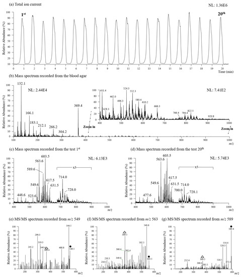 To observe the repeatability of using TD-ESI/MS to detect analyte ions recorded in positive mode in bacterial species, a metallic inoculating probe was used to collect a single colony of E. coli, a Gram-negative bacterium. The analysis was repeated for twenty measurements on twenty colonies grown on agar in a Petri dish, and the results of these repeated tests are presented in Figure 2. Although only a trace sample was collected on the probe, TD-ESI/MS was sensitive enough to detect analyte ions in the sample. For this reason, the analysis turned out to be simple and rapid, since the samples could be collected in the culture room with multiple probes and brought to the mass spectrometric lab for analysis. The relative standard deviation (RSD) of total ion current (TIC) of twenty analyses on the analytes collected from single colonies of E. coli, with TD-ESI/MS was 5.2% (Figure 2a). Figure 2b demonstrates the mass spectral signals acquired in the positive full scan mode from the analysis of the entire blood agar plate; it includes signals of all the amino acids, fatty acids, and lipids found in the entire blood agar plate. The mass spectral signals of the bacterial colonies of interest are actually the result of subtracting the signals of the blood agar matrix from the full scan signals of the entire blood agar plate. Figure 2c,d show the averaged mass spectra of the first and twentieth tests. As can be seen, both of the mass spectra are quite similar, indicating the reliability of the stability and repeatability of TD-ESI/MS. To further identify the signals in bacterial samples, TD-ESI-MS/MS analyses were performed, and the results are shown in Figure 2e–g. Since lipids have a characteristic fragmentation pattern such as m/z 369 (origin from m/z 386 intact cholesterol), it can be possibly recognized as one kind of lipids. Previous literature has also reported that these ion signals are mainly from phosphatidylglycerols (PGs), phosphatidylethanolamines (PEs), and phosphatidic acids (PAs) [32,33,34]. It should be noted that the analytical techniques used in these studies were either GC/MS or LC/MS/MS [48,49].