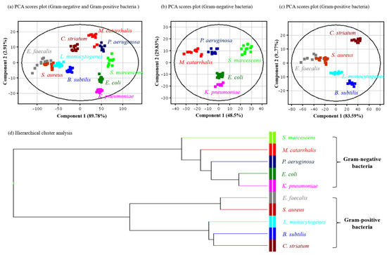 To efficiently distinguish between different bacterial species, the analytical results obtained by TD-ESI/MS were further analyzed with PCA. Figure 5a shows the PCA score plots for ten species of bacteria, and Gram-negative and Gram-positive bacteria were successfully distinguished based on the differences in their lipid profiles. With the same approach, the bacteria could be distinguished in the same category, regardless of whether they were Gram-negative or Gram-positive bacteria (Figure 5b,c). HCA, a grouping method that functions by creating a dendrogram, was also used to investigate if the lipid profiles of bacteria could be used to distinguish different species of bacteria. As shown in Figure 5d, the lipid profiles of closely related bacterial species (Gram-positive bacteria) are clustered closely together, while rather unrelated bacterial species (Gram-negative bacteria) are grouped separately.