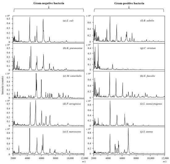 MALDI mass spectra recorded in positive mode for Gram-negative bacteria: (a) E. coli, (b) K. pneumonia, (c) M. catarrhalis, (d) P. aeruginosa, and (e) S. marcescens. MALDI mass spectra recorded in positive mode for Gram-positive bacteria: (f) B. subtilis, (g) C. striatum, (h) E. faecalis, (i) L. monocytogenes, and (j) S. aureus.