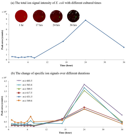 Owing to the merits of TD-ESI/MS, as mentioned above, the time required for analysis was extremely short, the sampling was simple, the interference of the cultural medium was avoided, and sample pretreatment was unnecessary. Continuous monitoring of the change in the lipid composition in a bacterial colony can be easily achieved for extended periods of bacterial growth time. Figure 8 shows the change in the main lipid ion signals in a colony (E. coli) with a culture time of 1–36 h. Due to the reduced oxygen-carrying capacity of the hemoglobin in blood agar, the red color of the blood agar plate became relatively darker than that of the fresh blood (inset of Figure 8a). The TIC of the bacterial lipid ion signals continuously increased with the culture time for the first 8 h (Figure 8a), and then became maximized at 24 h. After 24 h, the TIC of the bacterial lipid ion signals subsequently decreased. Possible reason is that some lipids were switched to other small metabolites (out of detected scan range) after the growth period of bacteria. Figure 8b shows the variation in the three primary lipid ion signals (i.e., m/z 603.5, m/z 563.6, and m/z 589.5) and the three minor lipid ion signals (i.e., m/z 617.5, m/z 631.5, and m/z 549.6) with the culture time (Figure 8b). As can be seen, the ion signal of the primary lipids substantially increased between 8 and 24 h, and continuously decreased after that. On the other hand, the three minor lipid ion signals gradually increased between 8 and 24 h, and then decreased after that.