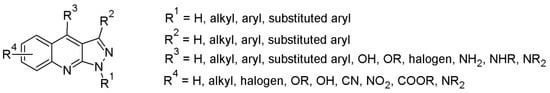 1H-Pyrazolo[3,4-b]quinolines are three-membered azaheterocyclic systems that are composed of a pyrazole-and-quinoline fragment (Figure 1). The parent structure can be modified with a number of substituents that have a great influence on the physical, photophysical and biological properties.
