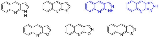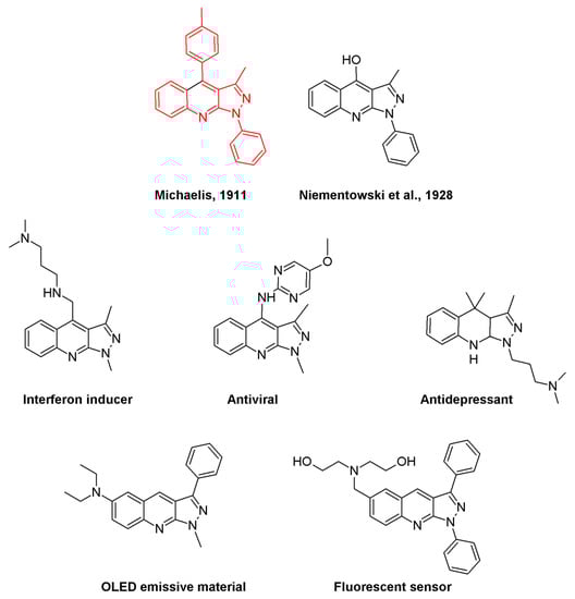 The first synthesis of this class of compounds was described in 1911 by Michaelis; however, the author incorrectly presented their structures. He concluded that the obtained compounds were a benzylidene derivative of 5-N-phenylamino-3-methyl-1-phenylpyrazole. This structure is marked in red in Figure 2 [1]. His results were later verified by other researchers. For this reason, the discoverer of this class of compounds should be considered as Niementowski and colleagues, who in their work presented the first structure of 1H-pyrazolo[3,4-b]quinoline in 1928 [2]. In the interwar period, there were some works by Koćwa, who also synthesised this system [3,4]. The remaining works on the synthesis of these compounds were published after 1945.