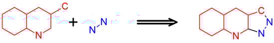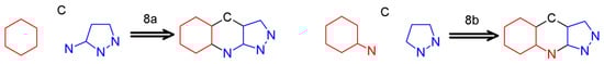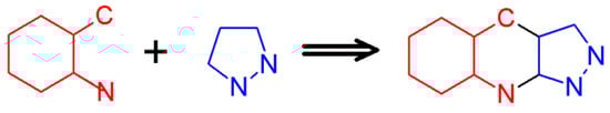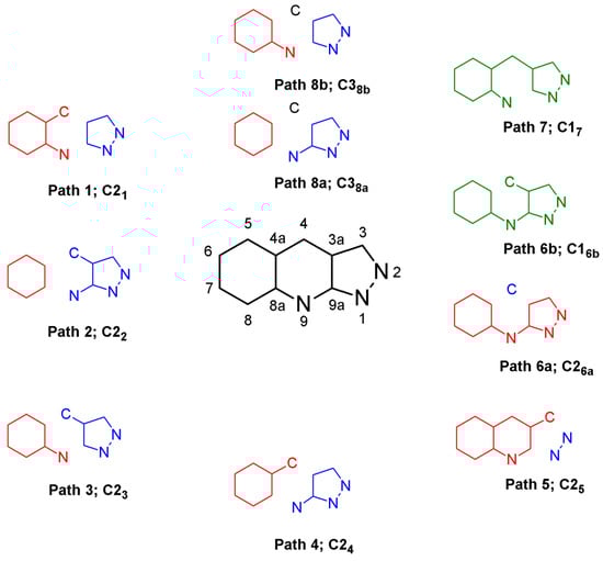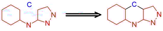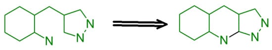 The use of a one-component system (C17), where the reductive cyclization of the o-nitrobenzylidene system is used, is practically irrelevant when it comes to the synthesis of pyrazoloquinolines. A bond is formed between the nitrogen N9 and the C9a carbon in the pyrazole ring (Figure 3; Path 7).