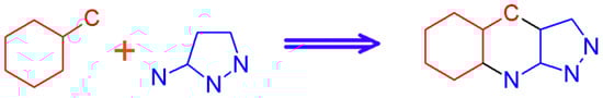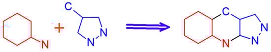 The two-component reaction (C23) in which one of the reactants is an aromatic amine and the other is a pyrazole derivative is one of the most valuable syntheses of the pyrazoloquinoline system. The entire spectrum of substituted anilines is commercially available, while the synthesis of pyrazole derivatives that contain an aldehyde or ketone group is not difficult. In this reaction, a bond is formed between C4 and C4a carbon, and between nitrogen N9 and C9a carbon (Figure 3; Path 3).