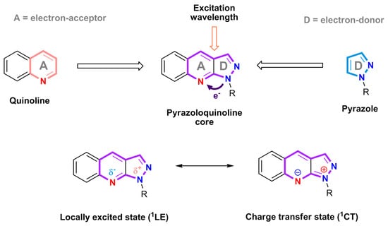 Figure 14. General structure and the light-induced formation of brightly emissive D-π-A pyrazoloquinoline species.