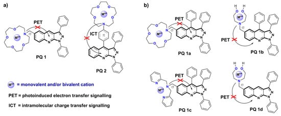 Figure 16. Structures of pyrazoloquinoline-based cation-sensitive fluorescence probes: (a) aza-crown-modified derivatives, reported by Rurack in 2002 [5]; (b) PET-signalling derivatives, investigated by Mac et al. between 2010 and 2013 [175,176,177].