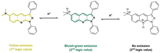 Figure 17. Schematic representation of 1H-pyrazolo[3,4-b]quinoline-based pH-sensitive ternary logic gate reported by Uchacz et al. in 2016 [178].