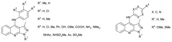 Figure 20. 4-(substituted-phenylamino)-1-R1-3-methyl-1H-pyrazolo[3,4-b]quinolines and 4-(4-substituted-pyrimidine-amino)-1-R1-3-methyl-1H-pyrazolo[3,4-b]quinolines.