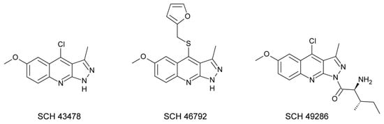 Figure 23. 4-chloro-3-methyl-6-methoxy-1H-pyrazolo[3,4-b]quinoline (SCH 43478); 4-[[(furan-2-yl)methyl]sulfanyl]-3-methyl-6-methoxy-1H-pyrazolo[3,4-b]quinoline (SCH 46792); and (2S,3S)-2-amino-1-(4-chloro-6-methoxy-3-methyl-1H-pyrazolo[3,4-b]quinolin-1-yl)-3-methylpentan-1-one (SCH 49286).