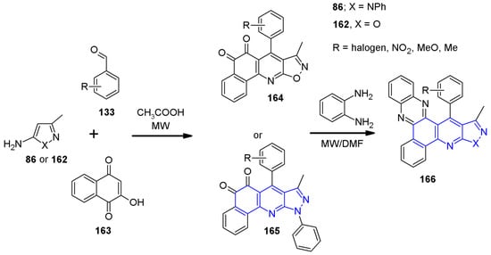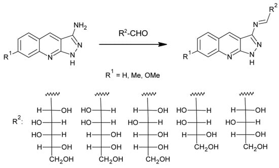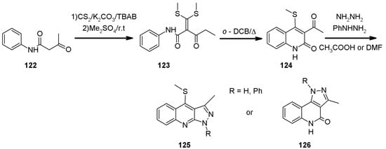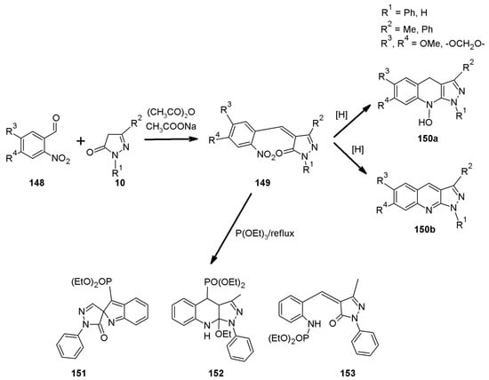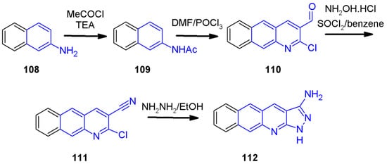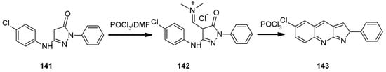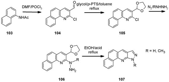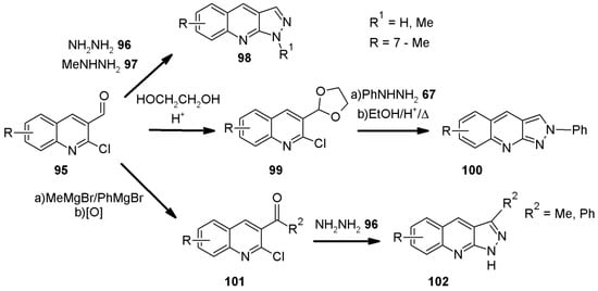 The most common way to obtain pyrazolo[3,4-b]quinolines by using the fifth path is by the reaction of the hydrazines RNHNH2 (R = H, aryl) with quinoline derivatives (Figure 8).