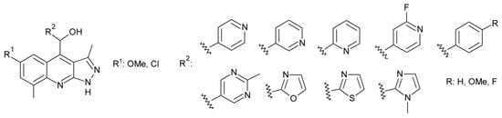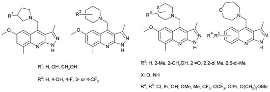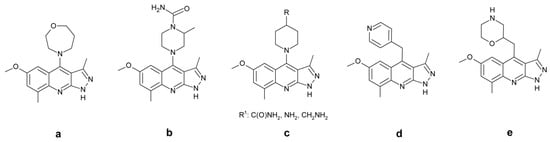 Figure 39. (a) 4-[6-Methoxy-3,8-dimethyl-1H-pyrazolo[3,4-b]quinolinyl]-1,4-oxazepane; (b) 1-[6-methoxy-3,8-dimethyl-1H-pyrazolo[3,4-b]quinolinyl]-4-carboxamid-3-methylpiperazine; (c) 1-[6-methoxy-3,8-dimethyl-1H-pyrazolo[3,4-b]-quinolinyl]-4-R-piperidines; (d) 4-[6-methoxy-3,8-dimethyl-1H-pyrazolo[3,4-b]quinolinyl]methylpyridine; and (e) 2-[6-methoxy-3,8-dimethyl-1H-pyrazolo[3,4-b]quinolinyl]methylmorpholine.