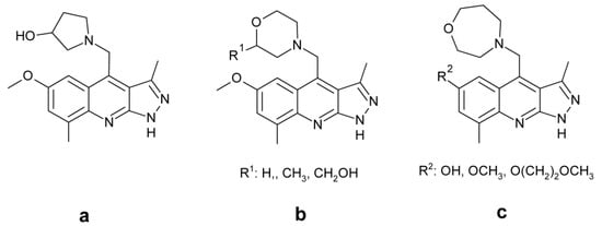 Figure 37. (a) N-[6-Methoxy-3,8-dimethyl-1H-pyrazolo[3,4-b]quinolinyl]methyl-3-hydroxypyrollidine; (b) N-[6-methoxy-3,8-dimethyl-1H-pyrazolo[3,4-b]quinolinyl]methyl-2-R1-morpholines; (c) N-[6-R2-8-methyl-1H-pyrazolo[3,4-b]quinolinyl]methyl-1,4-oxazepanes.