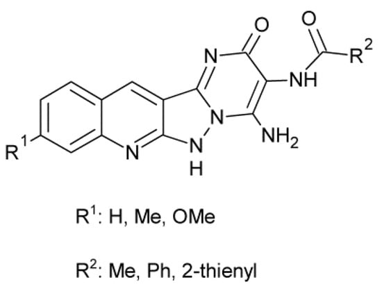 Figure 32. The structures of: (a) 2-methylpyrimido[1″,2″:1,5]pyrazolo[3,4-b]quinoline-4(1H)-one; and (b) 4-R-2-methylpyrimido[1″,2″:1,5]pyrazolo[3,4-b]quinolines.