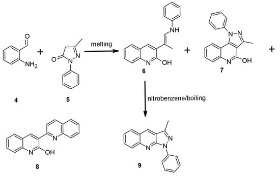 The reaction can be catalysed by acids and bases, but it also takes place in an inert environment. We start the description of synthetic PQ methods with the oldest results that were published by Niementowski and colleagues, who used the Friedländer condensation of anthranilaldehyde 4 and 5-methyl-2-phenyl-4H-pyrazol-3-one 5 (Scheme 2) [2]. As a result, three products were obtained: phenylhydrazone of 3-acetylquinolone 6; 3-methyl-1-phenyl-1H-pyrazolo[4,3-c]quinoline 7; and 3-(2-quinolyl)-quinolin-2-ol 8. The heating of phenylhydrazone 6 in the boiling of C6H5NO2 led to the formation of 1-methyl-3-phenyl-1H-pyrazolo[3,4-b]quinoline 9. Thus, this compound can be described as the first synthesised pyrazoloquinoline.
