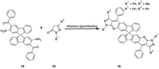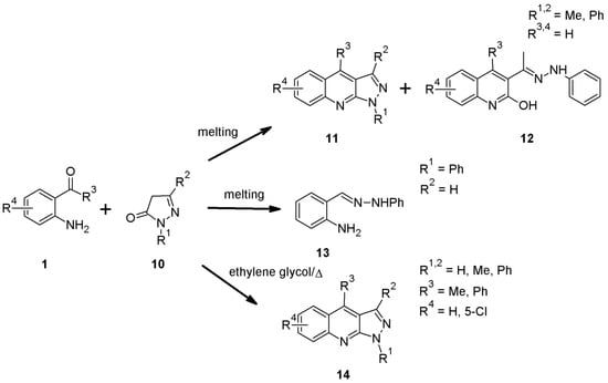 Danel, as an o-aminocarbonyl component 1, applied o-aminoacetophenone, o-aminobenzophenone and 5-chloro-2-aminobenzophenone, and a complete set of pyrazolones substituted with methyl, phenyl and hydrogen 10 (R1,2 = H, Me, Ph) (Scheme 3) [16]. The reaction was carried out in boiling ethylene glycol. Contrary to the two previously mentioned syntheses, in this case, all pyrazoloquinolines 14 were obtained in a single stage, although with different yields (20–85%). Sabitha et al. applied a microwave-assisted condenstion of 1 (R3 = H, Me; R4 = H) and 10 (R1 = Ph, R2 = Me) that was supported on clay, which led to 1H-pyrazolo[3,4-b]quinolines [17].