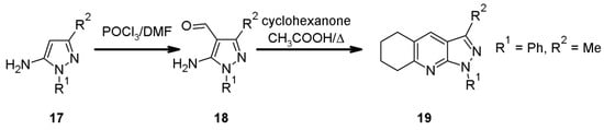 Breitmaier and Häuvel prepared pyrazole aldehyde 18 by the formylation of 5-amino-3-metyl-1-phenylpyrazole 17. This aldehyde 18 was condensed with cyclohexanone in glacial acetic acid, which yielded 5,6,7,8-tetrahydro-1H-pyrazolo[3,4-b]quinoline 19 (Scheme 5) [22].