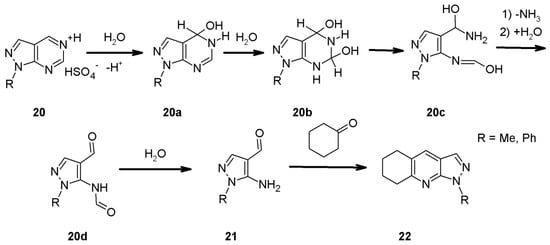 Instead of cyclohexanone, other cyclic ketones can be applied [23]. Higashino et al. prepared pyrazoloquinoline 22 by using aldehyde 21 that was prepared from 1H-pyrazolo [3,4-d]pyrimidine salts 20 and reactive carbonyl compounds, such as cyclohexanone/cyclopentanone with ethoxide ion as a catalyst (Scheme 6) [6].