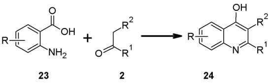 Another classic method of synthesising the quinoline 3 is the Niementowski reaction, in which anthranilic acid 23 and ketones 2 (or aldehydes) are used. As a result, 4-hydroxyquinolines 24 are formed (Scheme 7) [25].